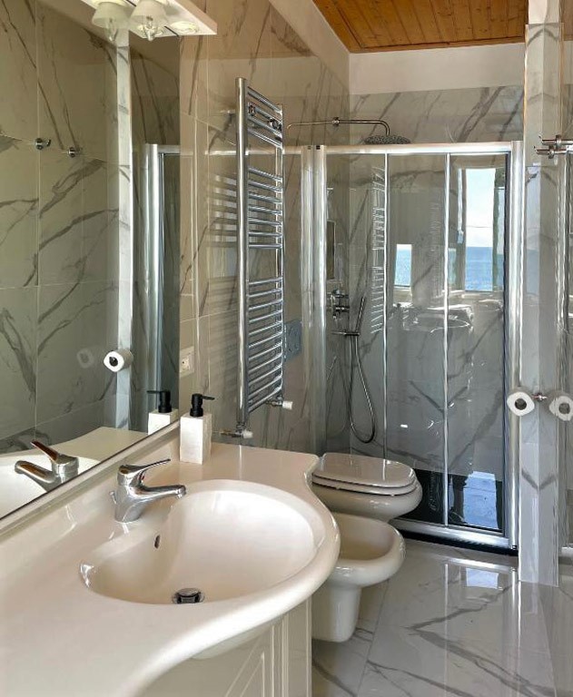 Cucina completa di tutto il necessario con terrazzo a picco sul mare. Bagno padronale completamente ristrutturato.